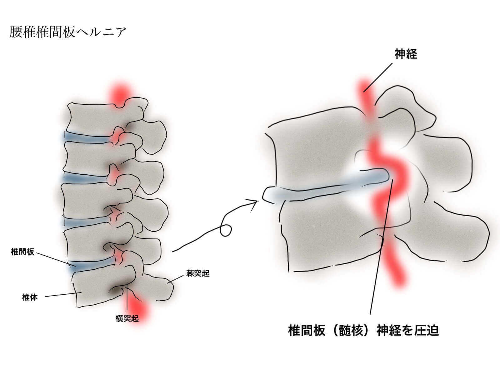 腰のヘルニアとは、椎間板の中から髄核(ずいかく)と呼ばれる組織が飛び出し、神経を圧迫することで痛みやしびれを発する症状です。